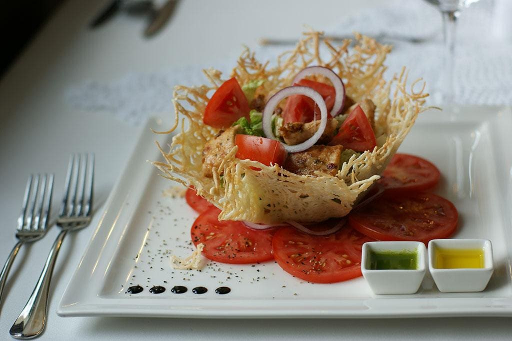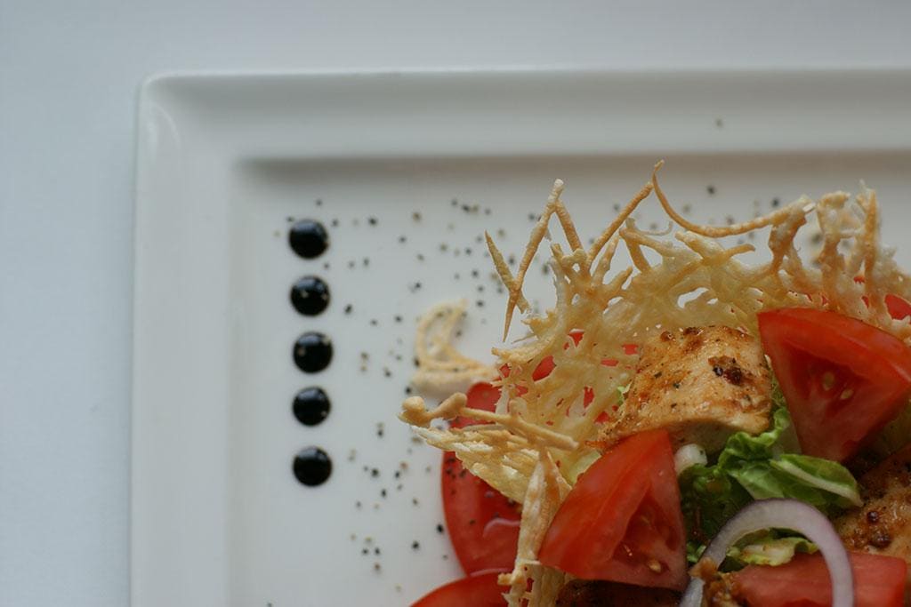 mozarella, pomidor, kapary, sos vinegrette, oliwa z oliwek, krem balsamiczny – 15 zł - Insalata Verde con pollo e pomodorini