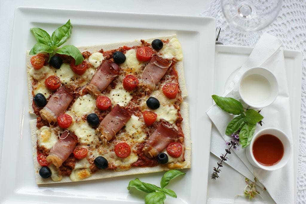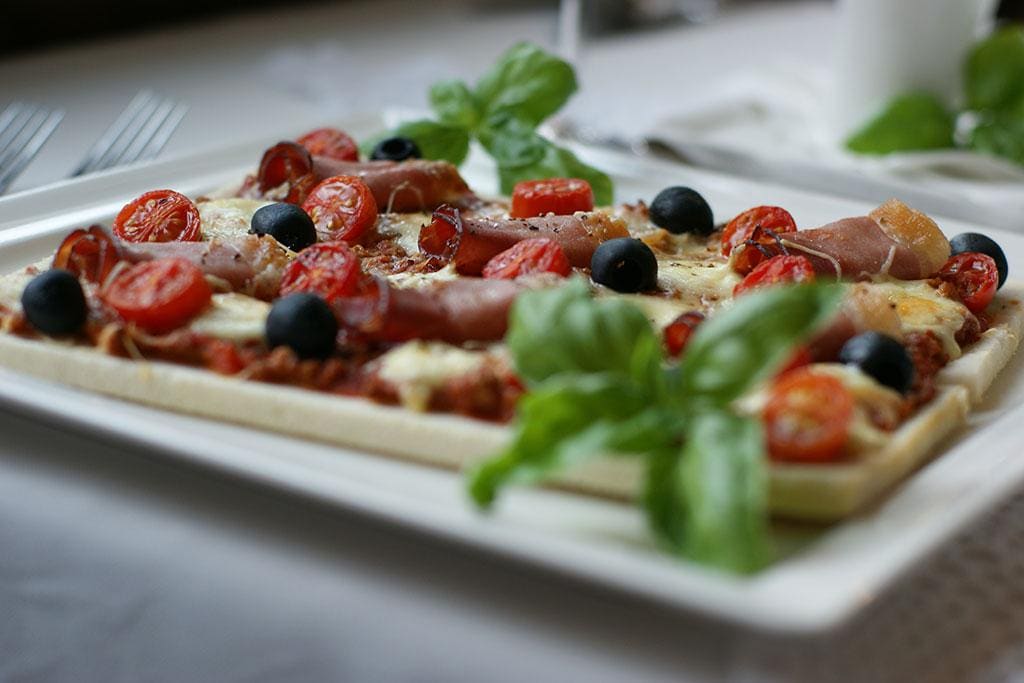 bruschetta zapiekana z szynką, serem i pomidorami – 18 zł - Bruschetta petto di pollo ala grilla con mozarella